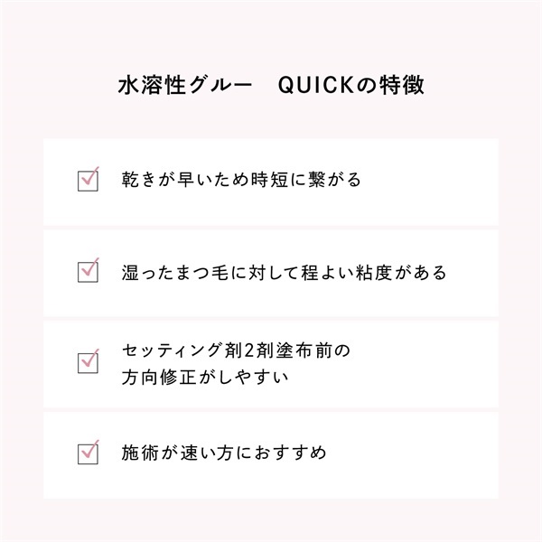 パリジェンヌラッシュリフト・まつ毛パーマの施術の際にロッドに塗り使用。 速乾タイプでピタッと固まる!スピードが重視されるセッティング剤2剤塗布前使用がおすすめ。 グルーが固まりはじめた時に「QUICKグルー薄め液」と併せてのご使用を推奨いたします。