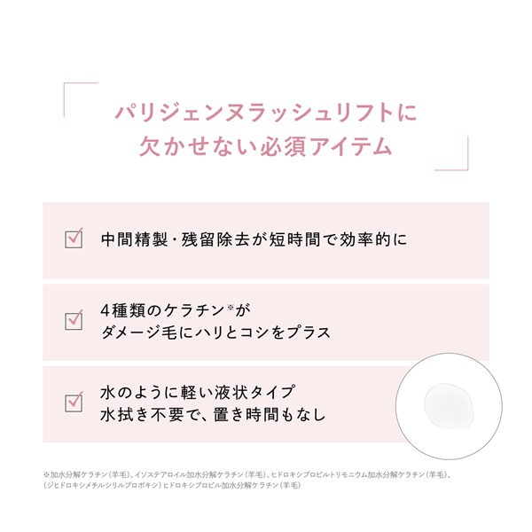 水、DPG、PPG-6デシルテトラデセス-30、グリセリン、加水分解ケラチン(羊毛)、イソステアロイル加水分解ケラチン(羊毛)、ヒドロキシプロピルトリモニウム加水分解ケラチン(羊毛)、(ジヒドロキシメチルシリルプロポキシ)ヒドロキシプロピル加水分解ケラチン(羊毛)、ブドウ液汁エキス、イソノナン酸イソノニル、クエン酸、クエン酸Na、プロパンジオール、メチルパラベン、プロピルパラベン、EDTA-2Na、フェノキシエタノール、香料