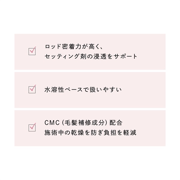 ラッシュリフト施術において、ロッド密着・毛流れ固定・薬剤浸透サポート を行う専用ジェル。 根元から均一にまつ毛を密着させることで、仕上がりの安定性と再現性を高めます。