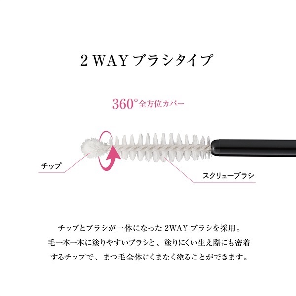 毛一本一本に塗りやすいブラシと、塗りにくい生え際にも密着するチップで、まつ毛全体にくまなく塗れる。