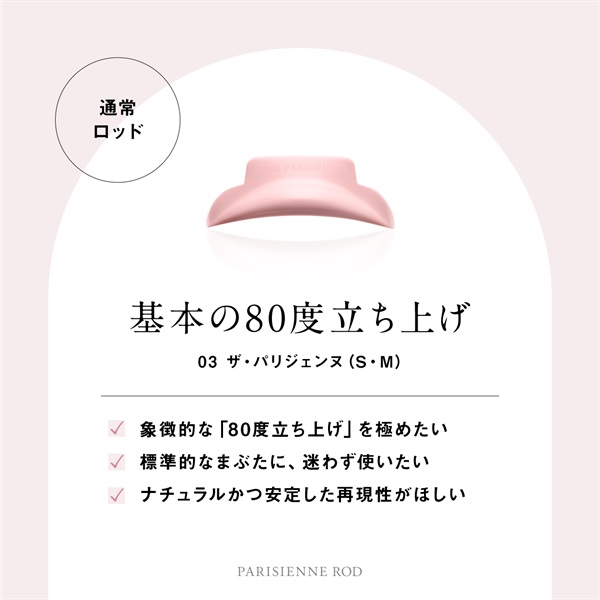 80度の立ち上げを象徴するスタンダードロッド。 根元からしっかり立ち上げ、パリジェンヌの基本となる仕上がりを再現。 基準の立ち上がりをつくるロッドです。 ※パリジェンヌラッシュリフト2.0の設計理解とあわせて使用することで、より安定した仕上がりと高い再現性を実現します。