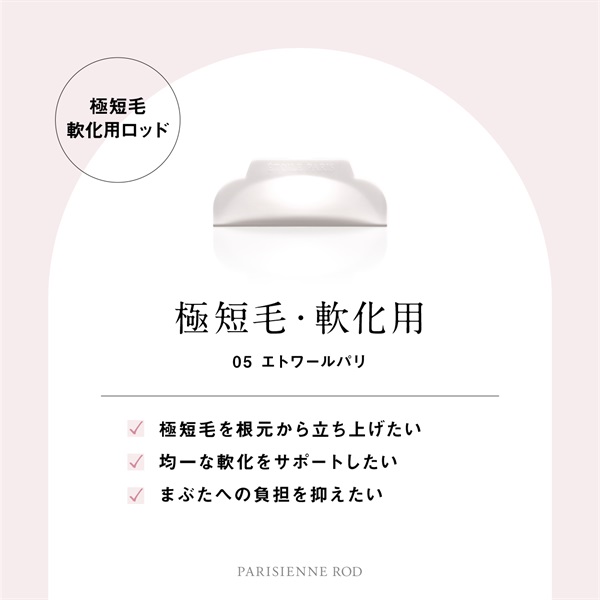 短いまつ毛も逃さず立ち上げる設計ロッド 極短毛や軟毛にもフィットし、根元から均一に立ち上げます。 ばらつきを抑え、安定した仕上がりに。 ※パリジェンヌラッシュリフト2.0の設計理解とあわせて使用することで、より安定した仕上がりと高い再現性を実現します。
